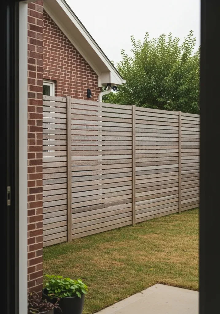 This tall horizontal slat fence stretches along the side of a brick home, creating a clean and consistent boundary. The evenly spaced boards provide privacy while still allowing subtle airflow. The light wood tone brightens the lawn area and pairs nicely with the red brick exterior. The straight lines give it a tidy and modern rustic feel that works beautifully in a compact yard.