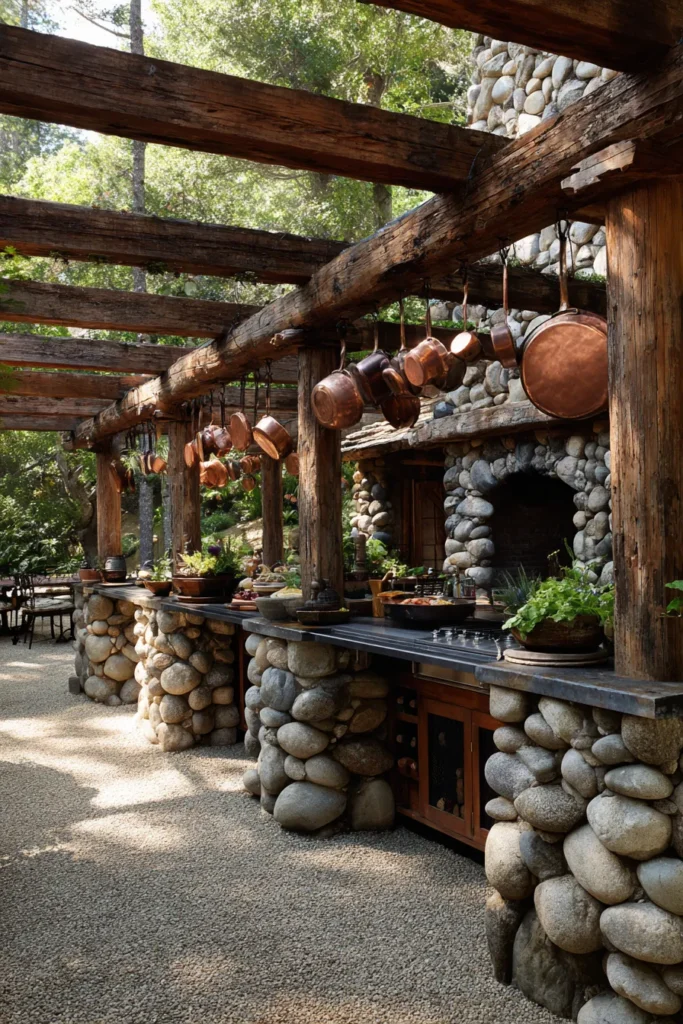 I think this design is so beautiful because it feels like a genuine, old-world retreat. It’s not just an outdoor kitchen, it’s a destination—like something you’d find on a gorgeous property in Tuscany or the mountains. The way the river stones anchor the entire space gives it such an authentic, earthy feel, and those chunky wooden beams draped overhead just scream cozy shelter. It makes me want to spend an entire afternoon out there cooking and laughing with friends. It’s simply perfect for anyone who loves that organic, imperfect rustic charm.
