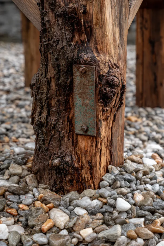 Sometimes, the beauty is all in the details and the materials you choose, and this photo is proof! This close-up focuses on a pergola post made from a natural tree trunk with its bark still intact, securely anchored in a base of smooth, river-washed pebbles and gravel. The rough, vertical texture of the bark contrasts beautifully with the smooth stones. A small, simple patinaed metal plaque is attached to the post, adding a touch of personalized history to the natural element.