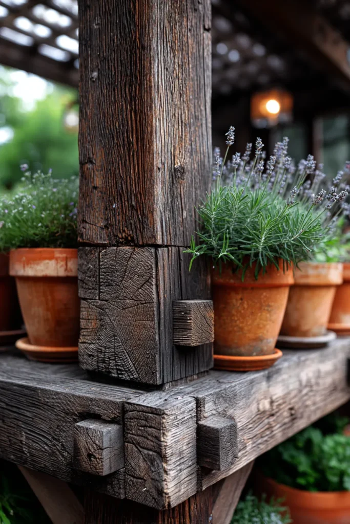 This is such a clever idea for adding both function and cozy charm to a rustic pergola post! This close-up highlights a beautiful rough-hewn wooden shelf built into a chunky pergola column. The exposed mortise and tenon joint detail is super rustic and artisanal. The shelf itself is filled with charming terracotta pots overflowing with fragrant lavender, instantly bringing color, scent, and a cottage garden feel right up to your outdoor living space.