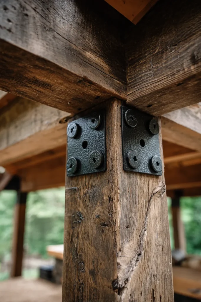 If you want your rustic pergola to feel super solid and permanent, this hardware is your answer. This close-up highlights the crucial connection point between a massive rough-sawn timber post and a beam, secured with prominent, hand-forged black iron plates and bolts. The stark, dark metal stands out dramatically against the warm, weathered wood grain, emphasizing the structure’s strength and adding a wonderful, durable old-world character to the design.