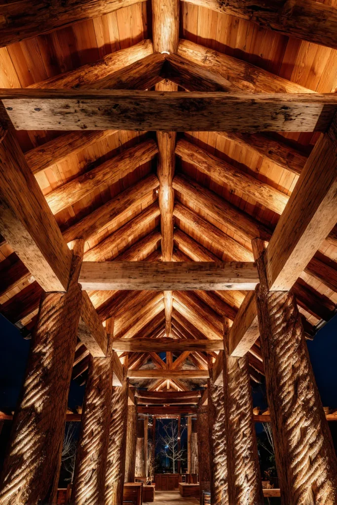 This photo is a fantastic example of using rustic wood architecture to create a cozy, sheltered feel from above. It’s a low-angle shot looking straight up into the roof of a pergola built with a striking, densely packed pattern of richly stained wooden rafters and beams. The wood has a deep, warm honey tone, and the structure is so robust and layered that it creates a visually interesting, almost tunnel-like effect. The dramatic lighting from below truly makes the wood grain glow.
