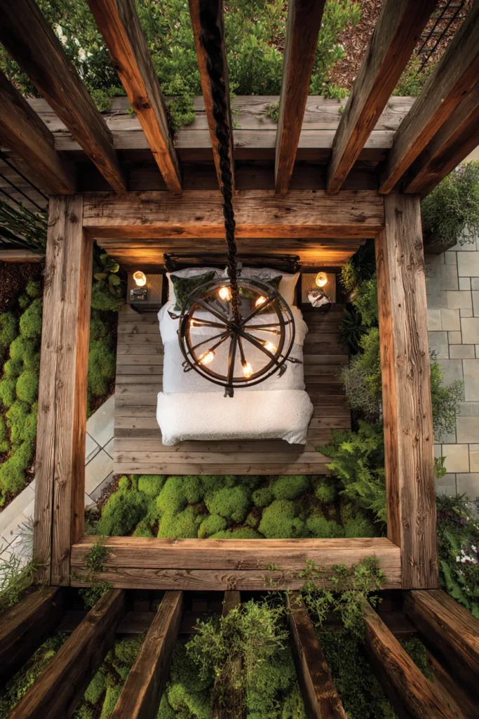 This design is truly impressive because it’s a total escape, blending luxury and wild nature seamlessly. The way the moss and deep green foliage contrast with the clean white bedding is just so beautiful and calming. It’s giving us all the gorgeous secret garden vibes, and that overhead perspective is so dramatic! Who wouldn’t want to fall asleep under that sturdy wooden roof, feeling utterly cozy and connected to the peaceful forest around them? It’s pure outdoor magic!