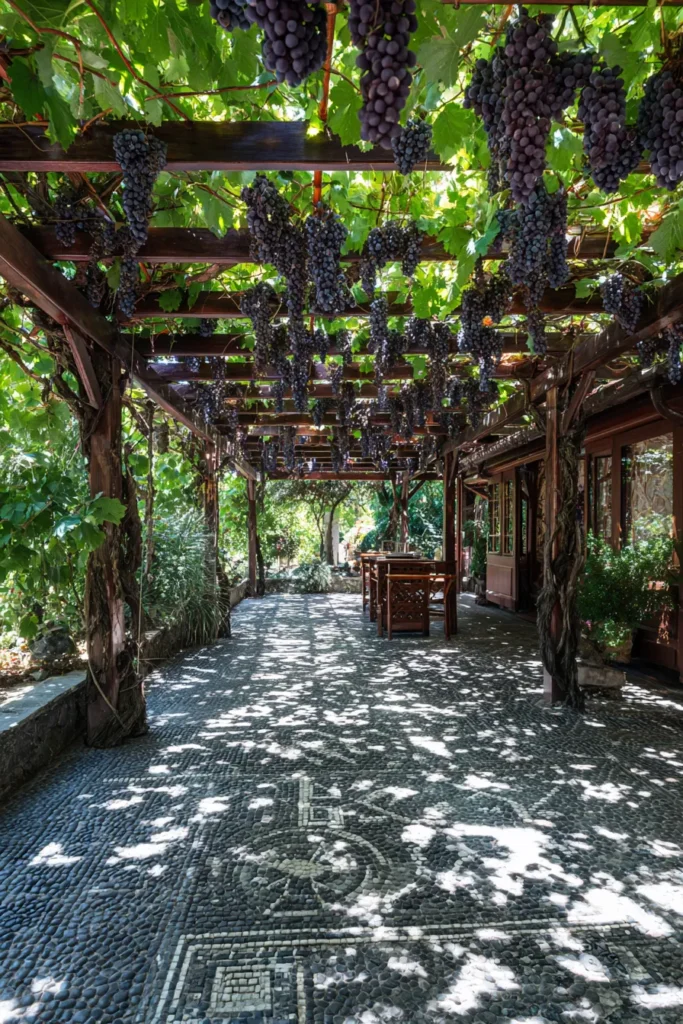I think the natural coziness created by that grapevine roof is absolutely genius! It’s the ultimate living roof that provides perfect dappled shade and that wonderful feeling of being enclosed by nature’s beauty. The grapes and the greenery add so much richness, texture, and a slight touch of harvest charm. This is beautiful inspiration for anyone who wants their pergola to feel functional, lush, and part of a timeless European garden.