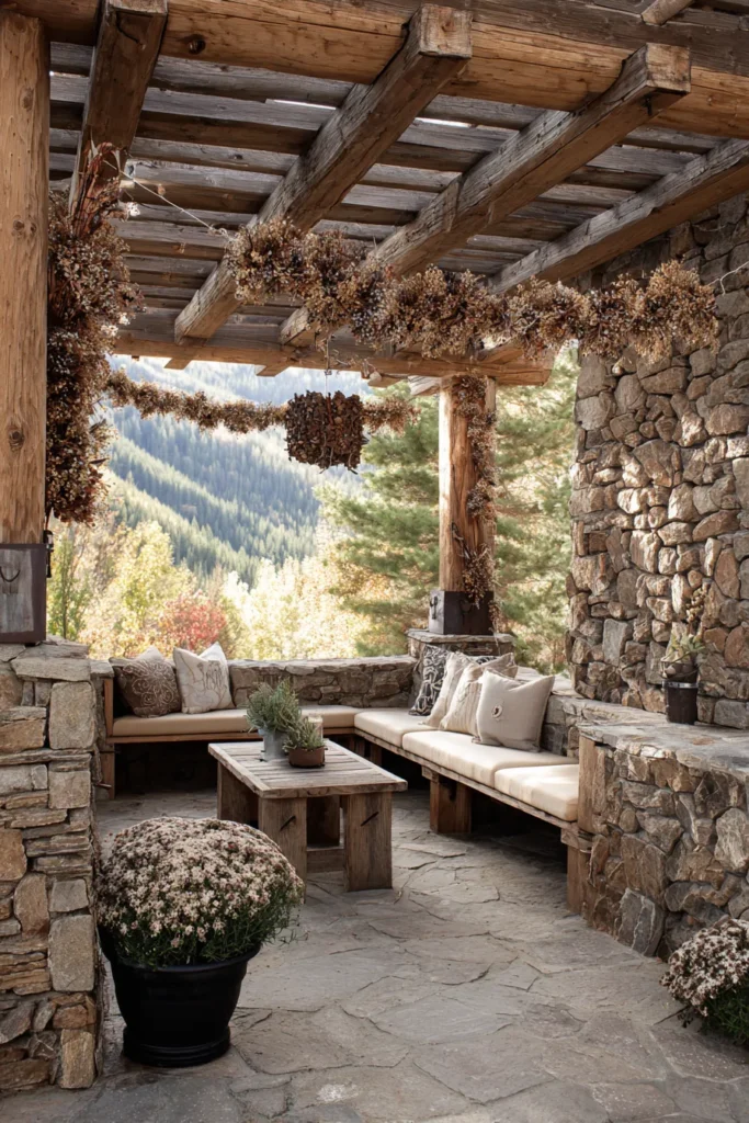 Get ready for the coziest mountain hideout ever! This pergola is integrated with a substantial, rustic outdoor lounge area where the walls are constructed from rough, chunky fieldstones. The roof is made of thick, unrefined timber and logs, with the cross beams supporting decorative bundles of dried herbs or grasses. A long, built-in sectional couch with simple neutral cushions invites relaxation while framing an incredible view of a distant valley.