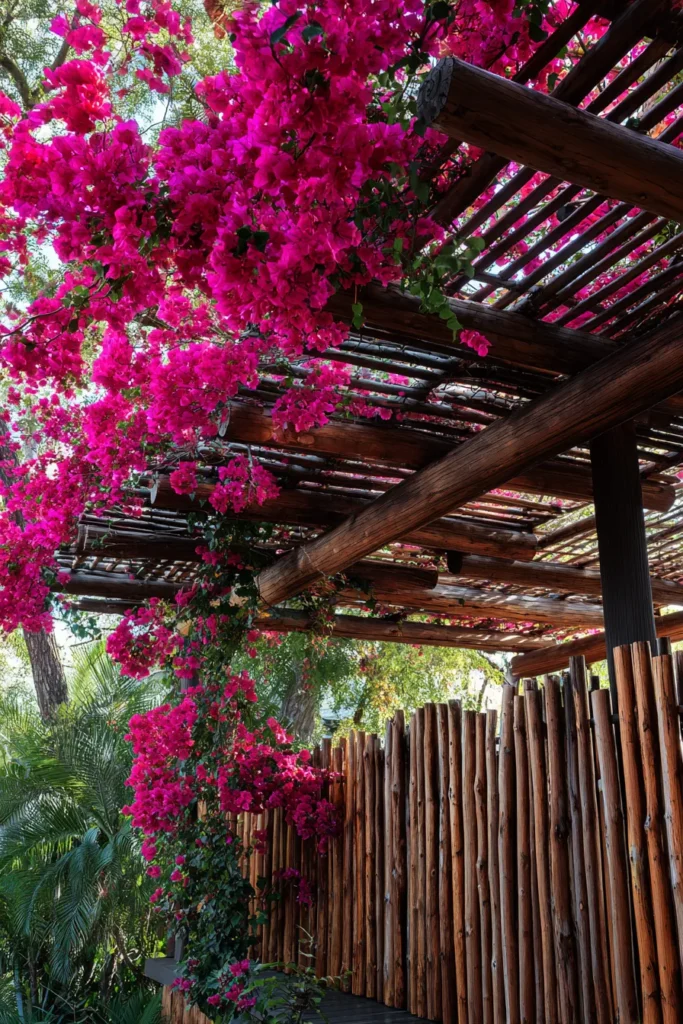 I think this pergola is just so cheerful and stylish! The contrast between the dark, earthy wood and those bold pink flowers is absolutely breathtaking and makes the whole space feel alive. And hello, that simple branch privacy wall is such a genius rustic touch—it adds amazing texture and makes the outdoor area feel like a private little hideout. It’s perfect inspiration for anyone who loves rustic style but wants to inject some major tropical color and flair into their backyard.