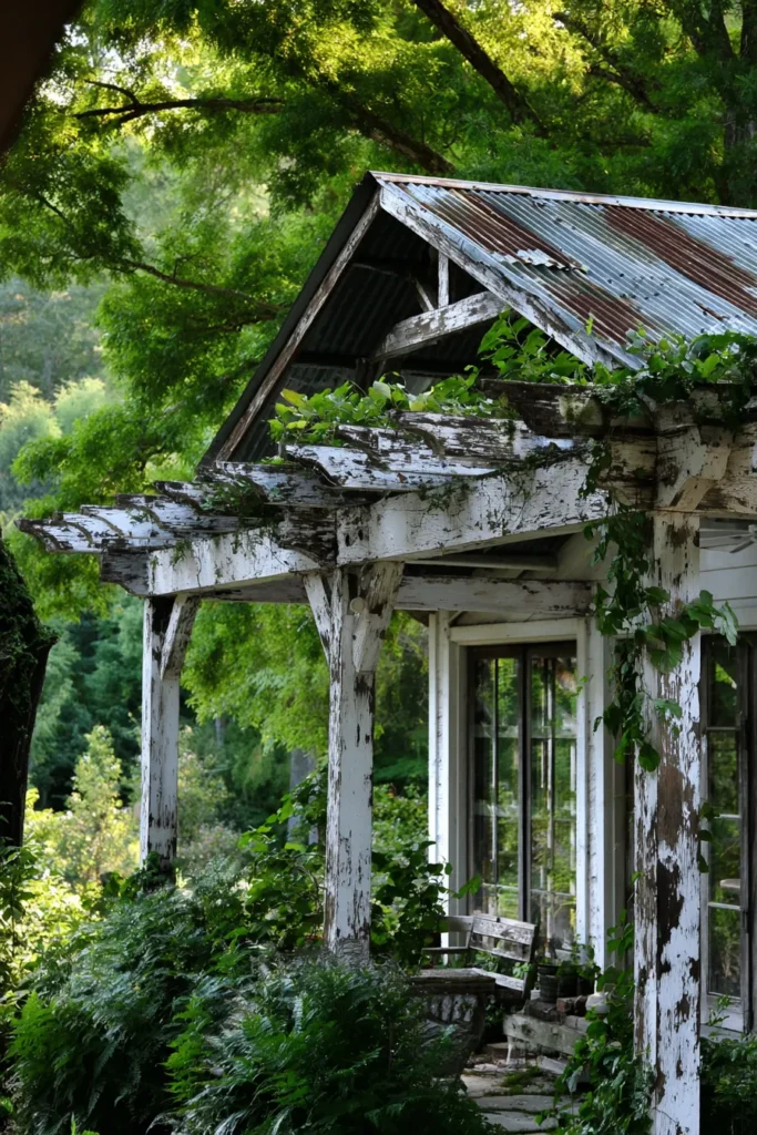 This design captures a perfectly dreamy, aged farmhouse aesthetic. The pergola is attached to the front of a structure, built from lighter, whitewashed or peeling painted wood that has a wonderfully distressed look. It’s been left open and is beautifully covered in vines and greenery, leading up to a roof that features a mix of wood and salvaged, corrugated metal sheeting. The whole picture is surrounded by lush ferns and plants, giving it a soft, slightly overgrown, storybook appeal.