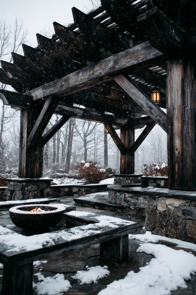 Even in the chilly months, a rustic pergola can create the coziest space, and this photo proves it! This substantial structure is built from dark, heavy timber posts and rafters, providing strong shelter. It covers a beautiful outdoor lounge area featuring a stone retaining wall and a central, mesmerizing fire bowl resting on a stone platform. The ground is lightly dusted with snow, and the bare trees in the background enhance the cozy contrast between the warm glow of the fire and the cold, crisp winter air.