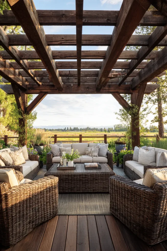 Talk about a dreamy spot to unwind! This pergola is built over a beautiful wooden deck and features a more regular, yet still very rustic, pattern of deep brown, stained heavy timber beams. The slatted roof provides just enough sun filtration without blocking the light completely, making it perfect for daytime lounging. Underneath, a plush, neutral-toned outdoor sectional and a rattan coffee table invite you to settle in, while the wide-open view of the surrounding golden field keeps the design feeling airy and expansive.