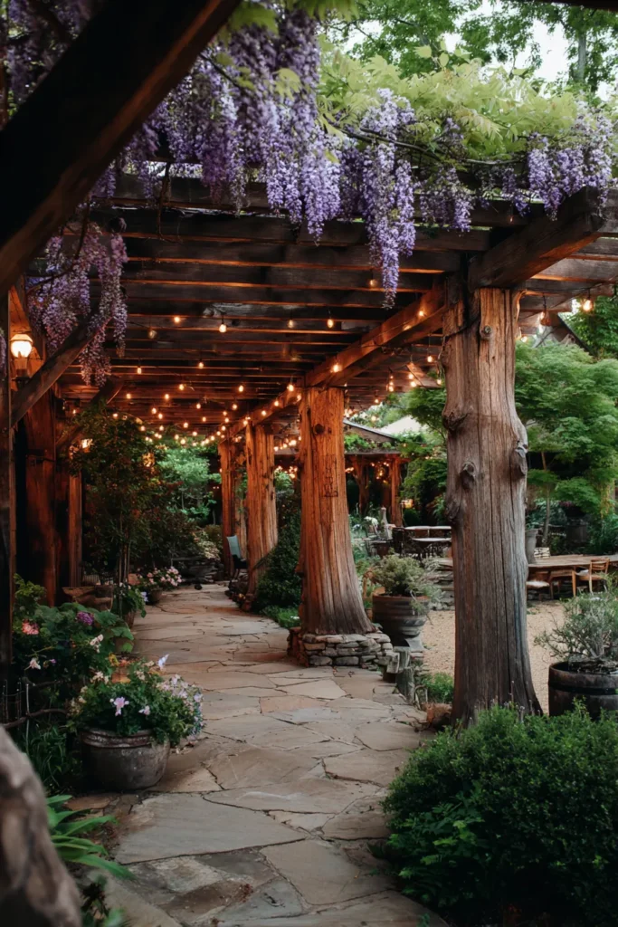 I think this image is so impressive because it’s a masterclass in grounding your outdoor design. Using a whole tree trunk as a post is such a fantastic way to instantly bring that authentic, rugged rustic vibe. It looks substantial, organic, and completely unpretentious. It’s a wonderful, simple idea to truly make your pergola look like a permanent, intentional part of your landscape.