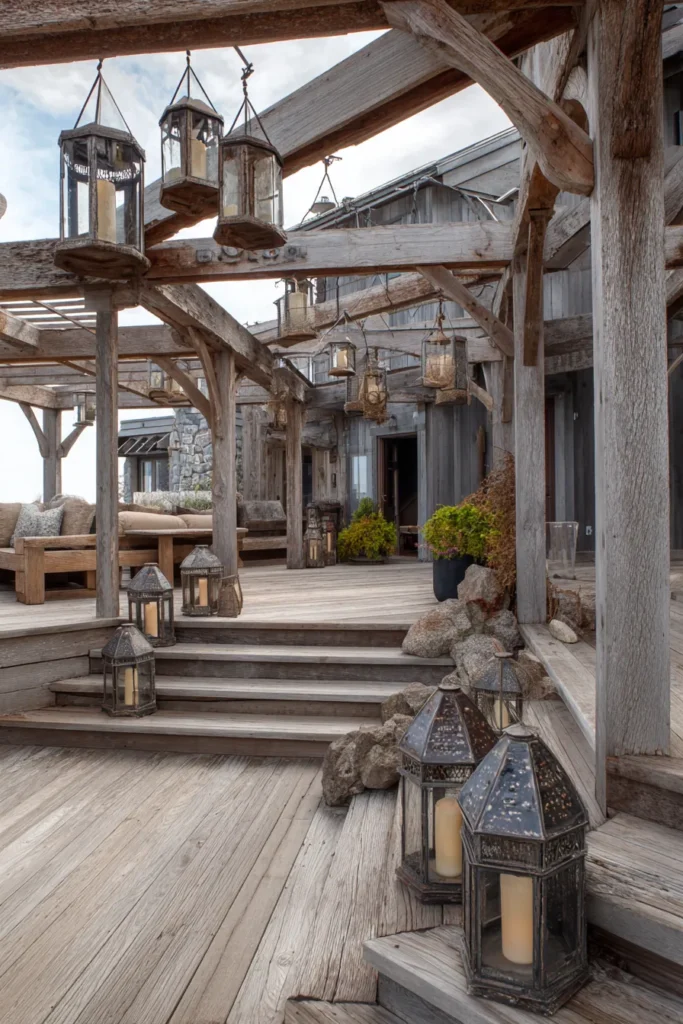 I really love how unapologetically rustic this pergola is! Using those full, heavy logs for the posts and beams is such a bold design choice that gives the whole porch a grounded, incredibly cozy feel. It makes me think of snuggling up on a porch swing with a wool blanket, listening to the quiet of a forest. The simple, dark lanterns add a perfect touch of functional style. If you’re a fan of log cabins or mountain retreats, this natural and impressive structure is going to be your absolute favorite!