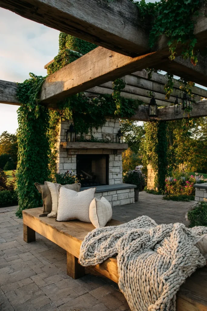 This pergola frames the most darling outdoor seating area that just oozes cozy comfort. It’s built from chunky, lighter-toned wood beams that are partially covered in lush greenery, creating a beautiful contrast against the stone fireplace that serves as the centerpiece of the nook. A simple, long wooden bench sits below, topped with a soft, oversized knit throw blanket and a couple of fluffy pillows—it’s the perfect blend of rugged materials and luxurious softness. The dark brick flooring grounds the entire space beautifully.