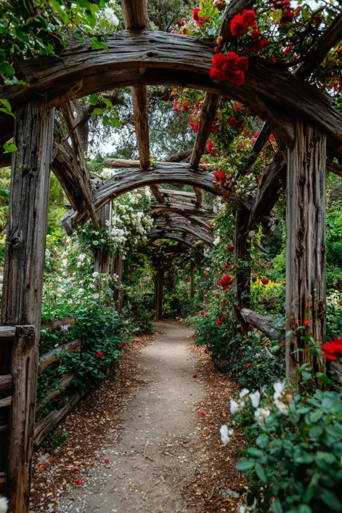 Oh my goodness, this rustic pergola design is pure enchantment! It’s less of a covering and more of a pathway, built with raw, natural-looking branches and heavy wooden supports that have been shaped into a series of beautiful, dramatic arches. The entire structure is completely engulfed in vibrant climbing red roses and rich green foliage, which gives it an intensely secret garden feel. Below, the soft gravel pathway invites you to take a slow, peaceful stroll right through the flowers.