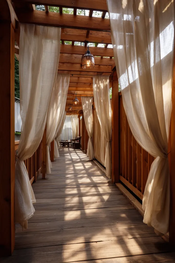 If you want to create a cozy outdoor room, this design is genius! This pergola is made from smooth, rich cedar wood, featuring a slatted roof that lets narrow lines of sunlight filter through. The entire length of the structure is enclosed on the sides by floor-to-ceiling billowy, sheer off-white curtains draped across the beams. The fabric transforms the space into an intimate, bohemian-style pavilion, making it feel protected, private, and incredibly bright and airy all at once.