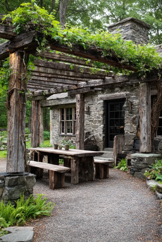 This design blends history and nature for the most charming, timeless aesthetic. The rustic pergola is attached to what looks like a beautiful old stone cottage, built with heavy timber beams and rough, dark logs that are already wonderfully covered in established vines and deep green ivy. Beneath the natural canopy, a solid wooden picnic table and matching benches invite casual, outdoor meals. The surrounding gravel and natural stone walls keep the focus squarely on that lovely, rugged charm.