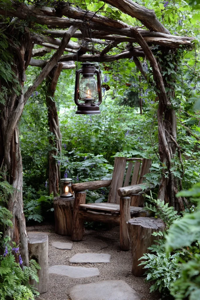 I just adore the pure, woodsy charm of this little retreat. It’s so unique because it embraces the wildness of nature rather than trying to be neat and straight. It feels like a secret space where you can escape the world, and that vintage lantern just adds the perfect touch of storybook charm. This is absolutely the perfect inspiration for anyone with a cozy corner of their garden they want to transform into their own little sanctuary.