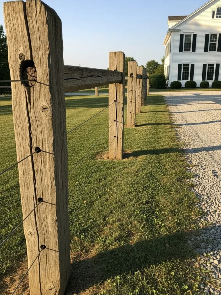 This rustic fence features thick wooden posts with visible grain and age marks, paired with simple wire strands running cleanly between them. The spacing feels open and practical, letting the landscape breathe while still defining the edge of the property. The gravel drive and wide lawn beside it give the fence a calm farmhouse feel that looks rooted and intentional rather than decorative.