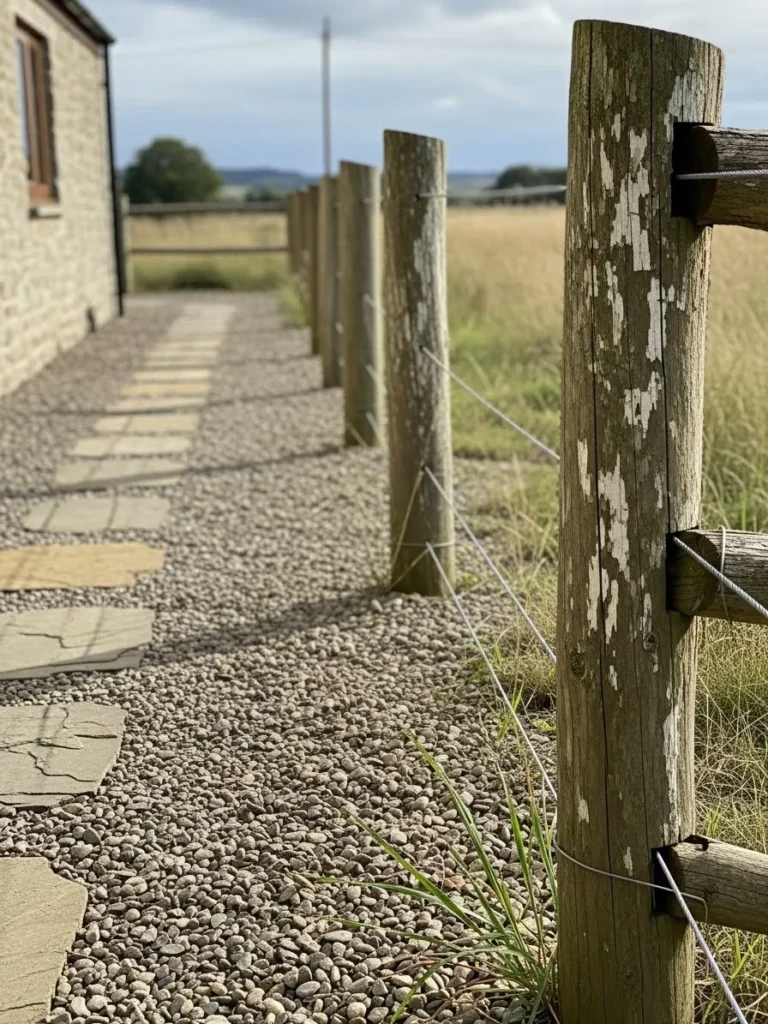 This fence lines a neat stone path with tall wooden posts connected by simple wire. The wood shows peeling texture and natural aging, which adds instant farmhouse character. The clean walkway beside it keeps the whole scene feeling calm and intentional without looking too polished.