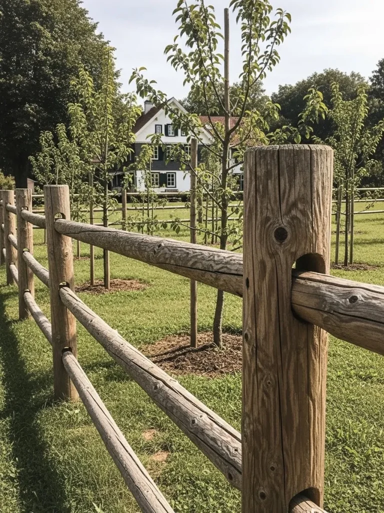 This fence features smooth horizontal wooden rails supported by thick posts, creating a strong and timeless outline. The open lawn and farmhouse in the distance give it an airy and welcoming feel. Everything looks balanced and thoughtfully spaced.