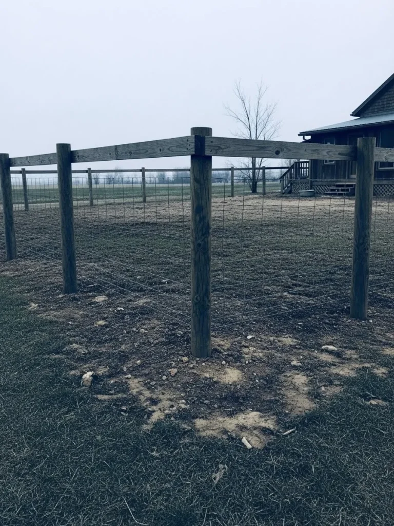 This fence runs through a grassy yard, using wood posts and wire panels to define space without blocking views. The ground looks slightly worn, adding to the everyday farmhouse feel. It feels practical, open, and easygoing.