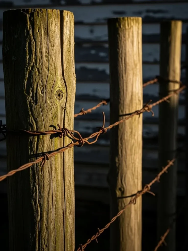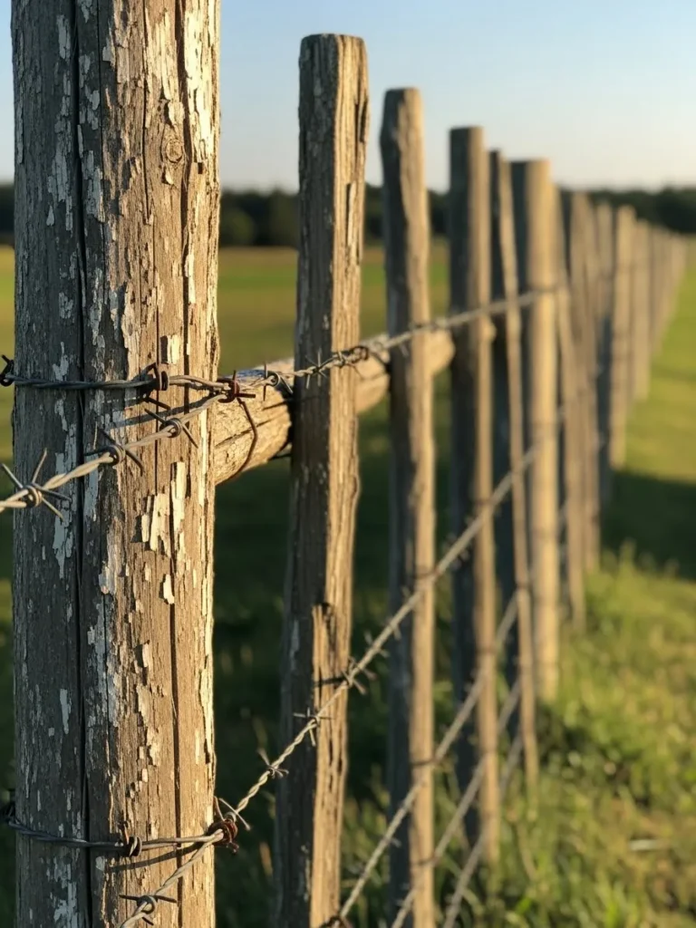 This fence focuses on rhythm, with tall wooden posts set in a straight line and wire running cleanly between them. The wood shows cracks and texture from years outdoors, adding depth and character. The soft background keeps the fence feeling calm and balanced.