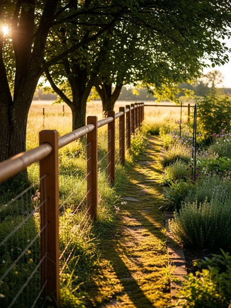 This design keeps things minimal with slim wooden posts and stretched wire disappearing into tall grasses and wildflowers. The fence almost blends into the landscape, creating gentle boundaries without interrupting the natural flow of the field. Soft light and uneven ground make it feel relaxed and very countryside inspired.