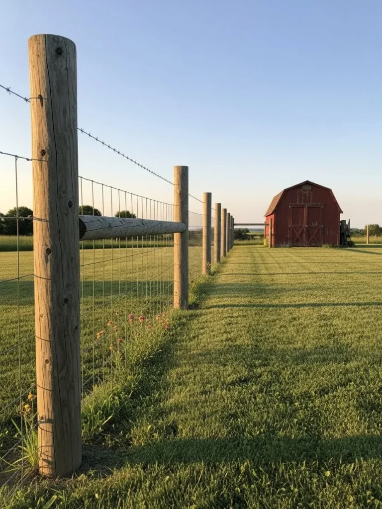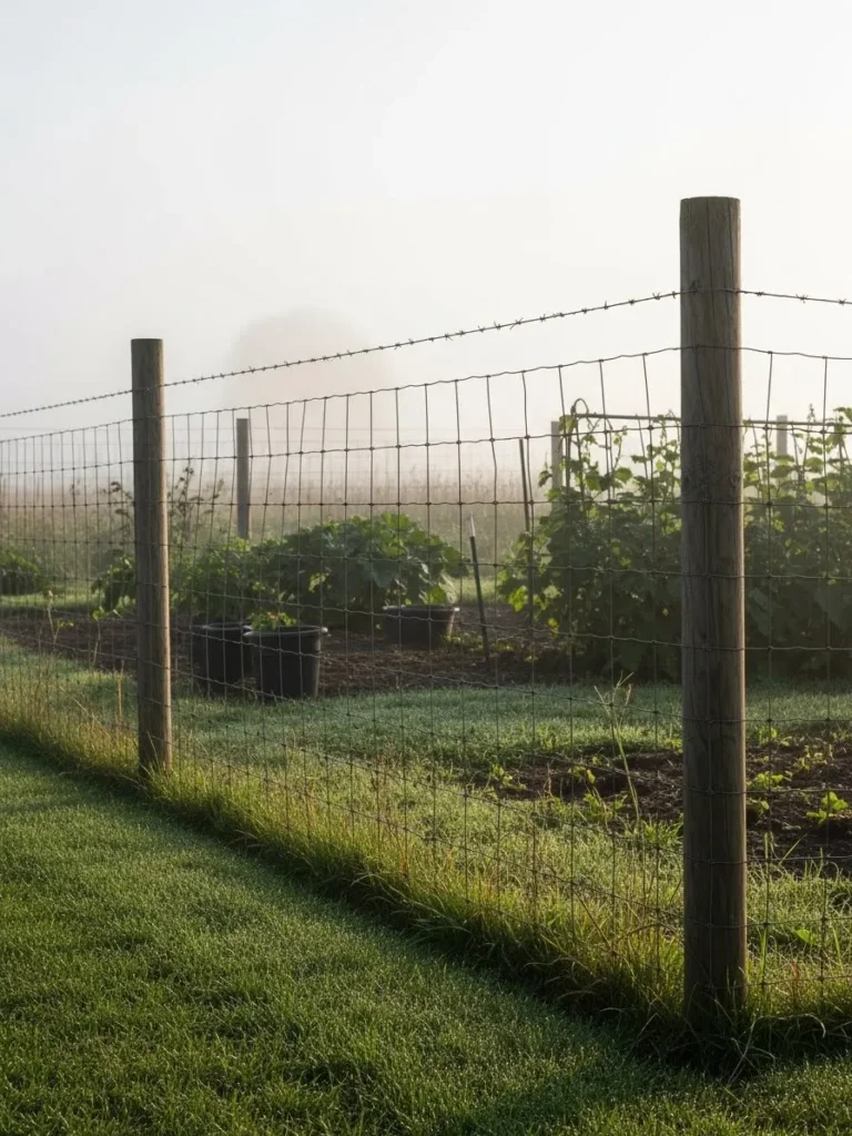 This rustic fence uses sturdy wooden posts paired with neat wire panels to frame a well kept garden. The grass is trimmed and the wire lines feel intentional, giving the fence a balanced look that sits between practical and pretty. The light morning haze adds a soft farmhouse mood.