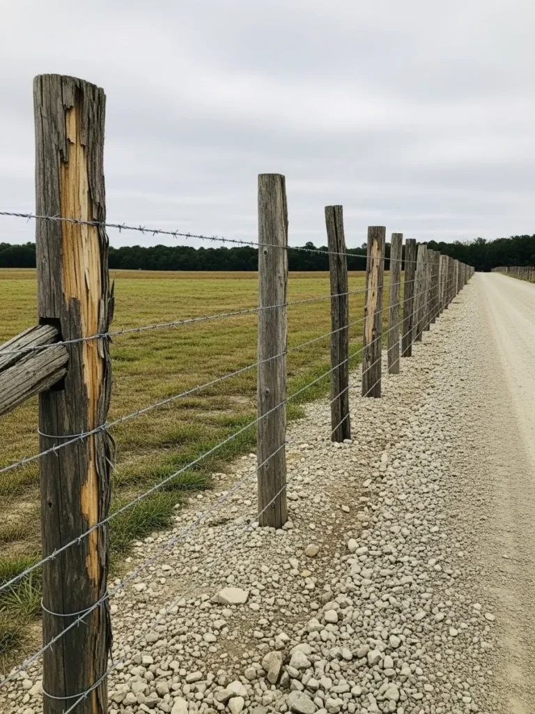This fence runs along a gravel road, using weathered wooden posts and stretched wire to create long, clean lines. The spacing feels even and purposeful, making the fence look strong and dependable. The open fields beside it add to that classic rural scenery.