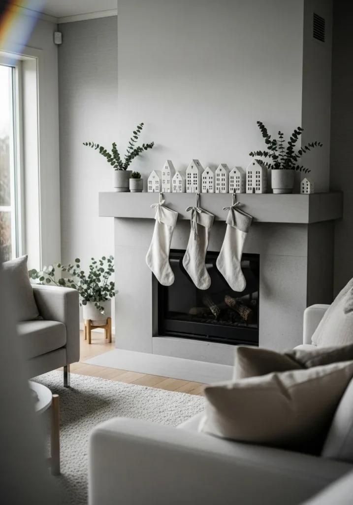 This Scandinavian mantle keeps things serene with a palette of whites, greys, and soft beiges. Three simple stockings hang neatly, while ceramic house ornaments and eucalyptus branches add structure and calmness. The clean lines, minimal shapes, and gentle natural light make the entire space feel like a quiet winter morning.