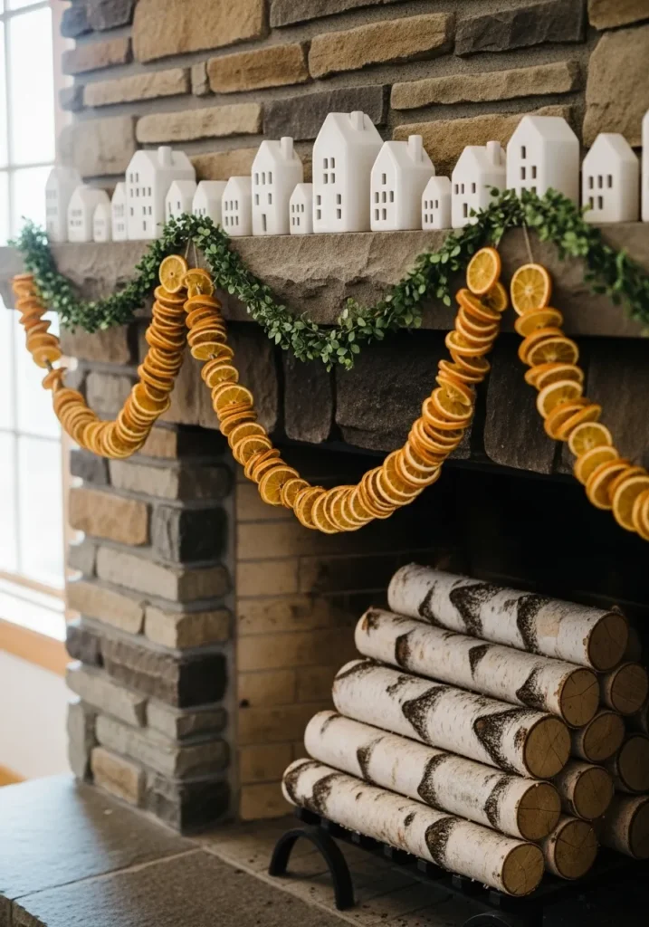 This stone fireplace pairs earthy textures with cheerful pops of color. White ceramic houses line the mantle, surrounded by lush green garland and long strands of dried orange slices draped beautifully across the front. The stacked birch logs underneath add even more Scandinavian authenticity.