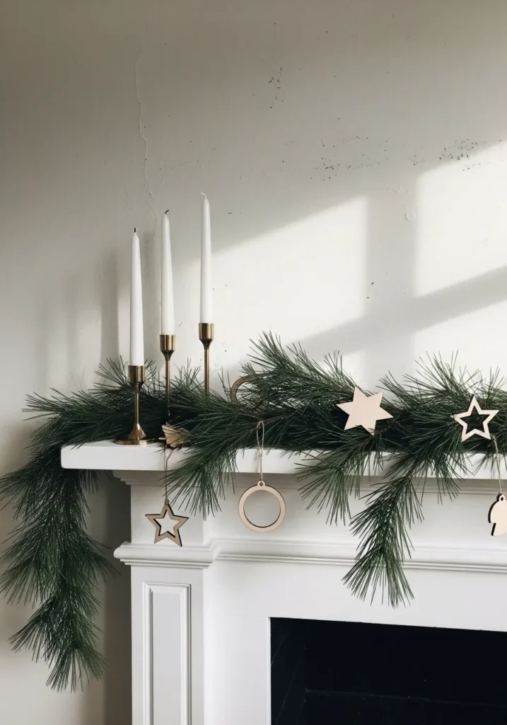 A crisp white mantle with delicate pine garland and simple wooden star ornaments creates the ultimate minimalist Christmas statement. A trio of slender candles in brass holders adds a gentle glow that makes the space feel warm without stealing attention. Every detail here whispers calm, not chaos.