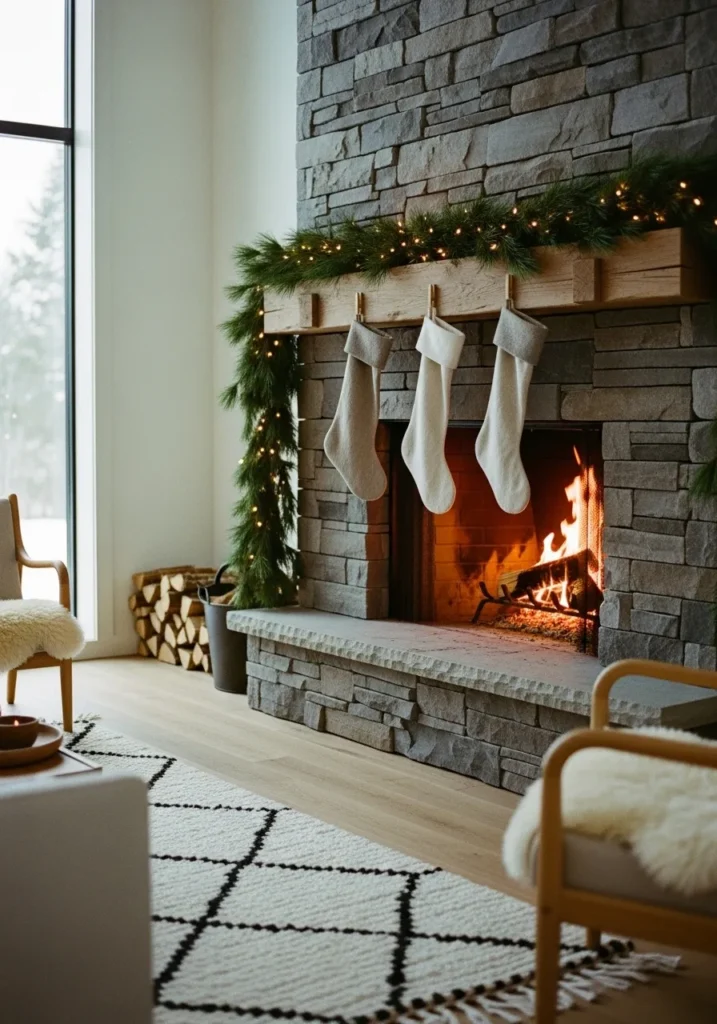 This stone fireplace mantle embodies the heart of Scandinavian coziness with its blend of neutral tones, natural materials, and understated Christmas charm. Simple beige stockings hang gracefully from a chunky wooden beam, while a garland of evergreens and twinkling fairy lights add a gentle festive touch. The entire room glows with a serene, firelit warmth that makes it feel instantly inviting.