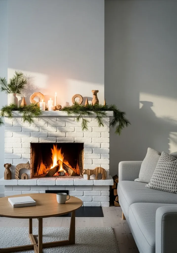 This Scandinavian fireplace is a perfect mix of rustic charm and modern minimalism. The white brick mantle feels fresh and timeless, while pine branches, simple candles, and carved wooden figures bring a natural, handmade feel. The neutral palette, combined with the warm glow of the fire, makes the space feel like the heart of a peaceful Nordic cabin.