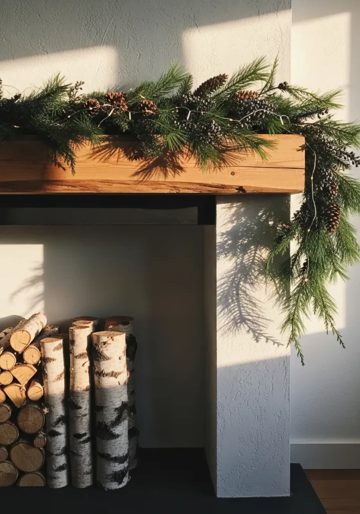 A simple wooden mantle gets dressed in nature’s best with pine garlands and cones, all softly touched by golden light. The stacked birch logs below give it that Scandinavian cabin charm while keeping the look minimal and organic. The rough wood grain and the fresh green needles make a perfect winter match.
