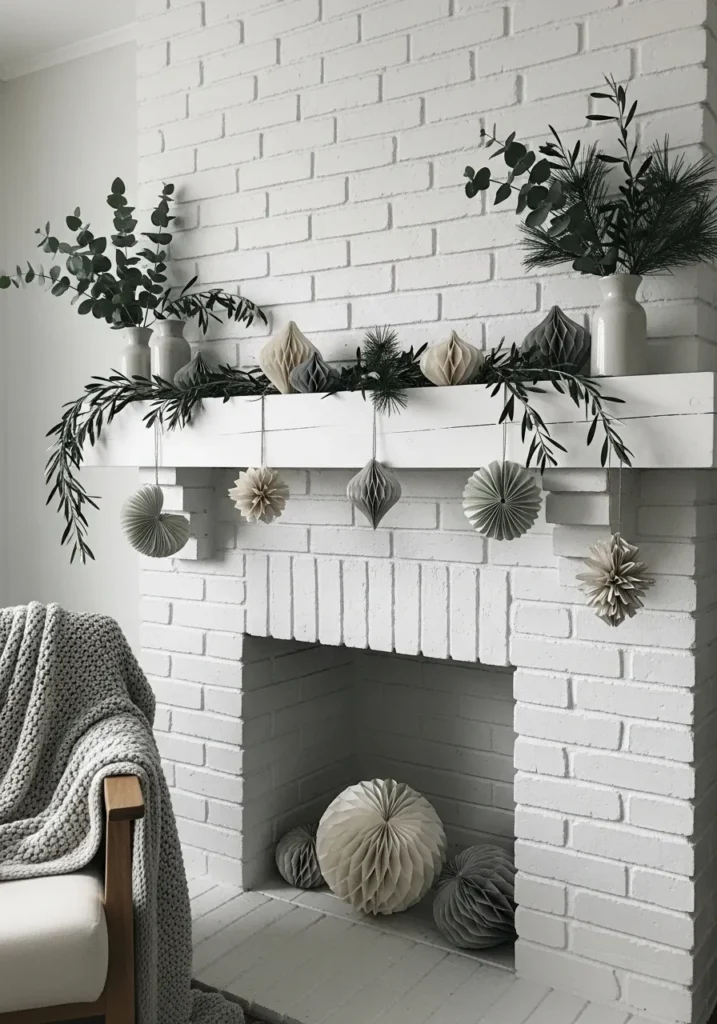 This white brick fireplace gets a dose of Scandinavian playfulness with honeycomb paper ornaments and natural greenery. Olive and eucalyptus branches bring freshness, while neutral-toned decorations hang in perfect symmetry. It’s airy, calm, and a little bit whimsical.