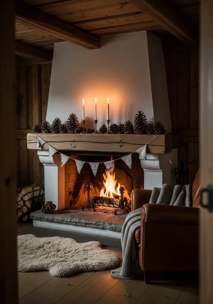 Thick pinecones, flickering candles, and a simple linen bunting make this wooden-beamed fireplace glow with rustic Nordic charm. The mix of textures—wood, wool, and firelight—creates the perfect cozy retreat after a snowy day.