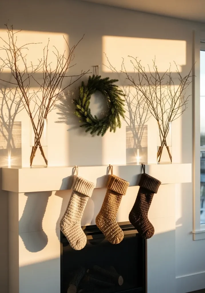 Warm sunlight floods this pared-back fireplace, where neutral knitted stockings and bare branches create a stunning natural moment. A simple evergreen wreath adds focus without overpowering the space. The golden glow makes everything feel alive and soft.