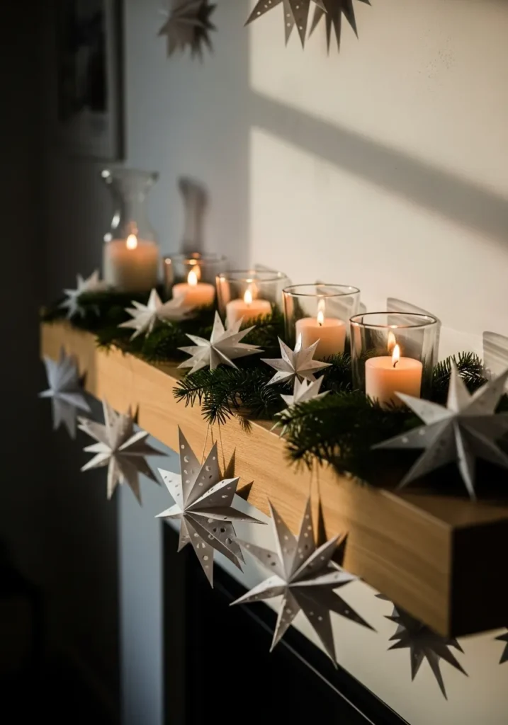 White paper stars hang gracefully beneath a wooden mantle lined with candles and pine. The gentle flicker of candlelight and the soft glow of paper stars make the space feel magical yet grounded. It’s Scandinavian coziness at its finest.