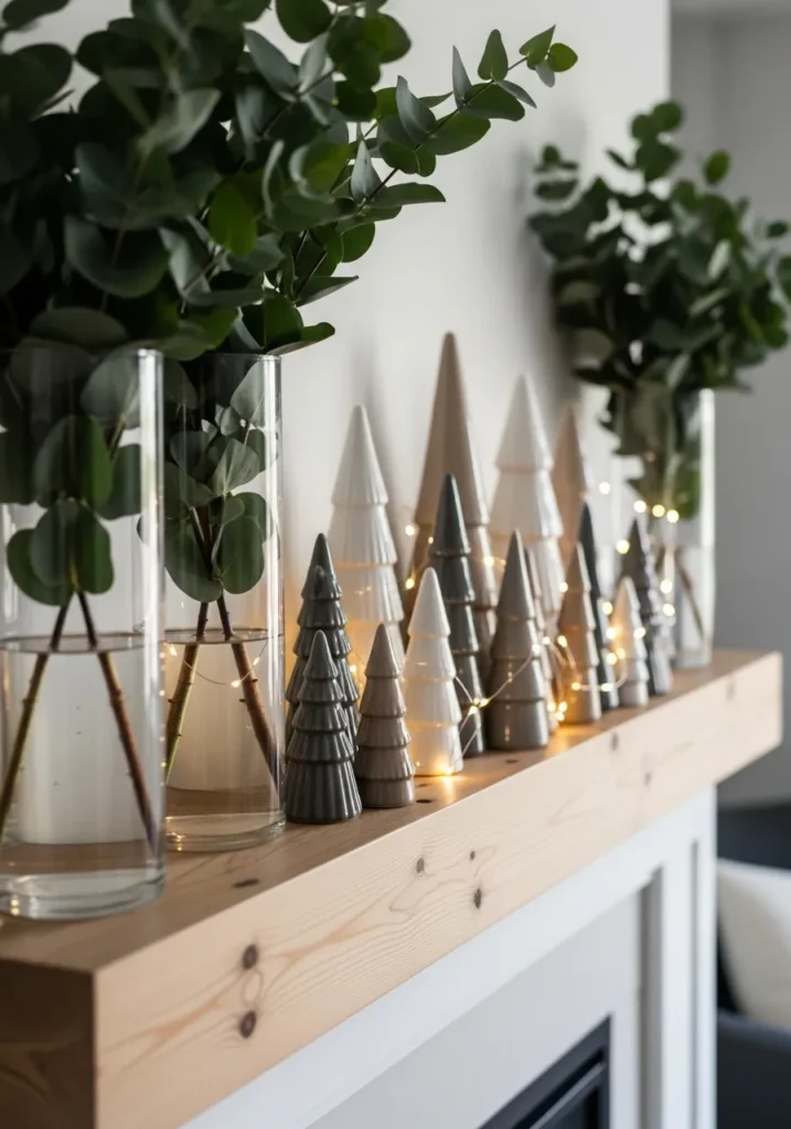This mantle features a charming lineup of glossy ceramic trees in shades of gray, beige, and white. Soft fairy lights wind between them, while tall vases filled with fresh eucalyptus add height and a hint of green. The natural wood shelf keeps it grounded, giving the display a warm Scandinavian balance between simplicity and sparkle.