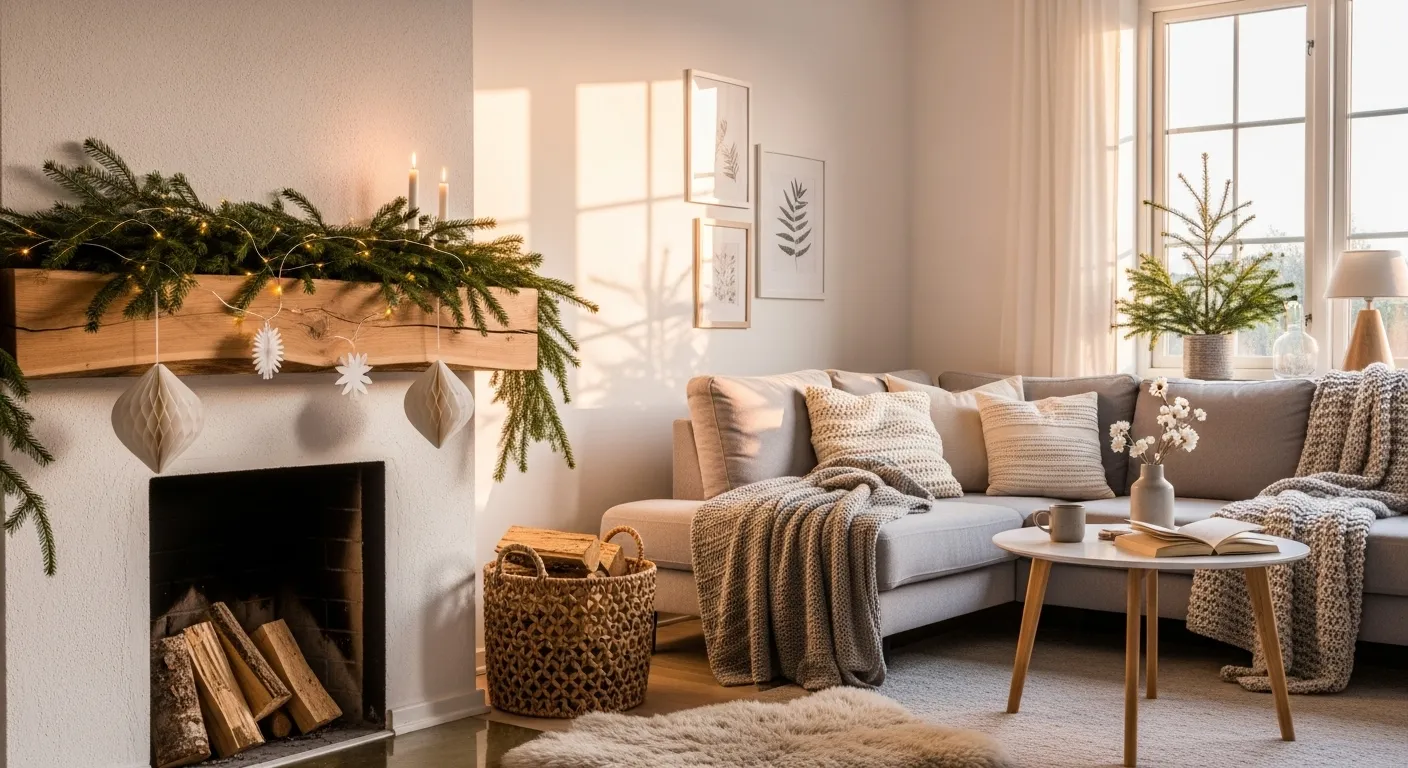 This mantle captures the gentle glow of a Scandinavian winter afternoon. Natural sunlight spills across the room, highlighting the simple pine garland and delicate paper stars hanging gracefully above the stacked firewood. Soft textures like the chunky knit blanket and neutral sofa keep the room feeling warm and effortless, while twinkling fairy lights add just the right touch of quiet festivity.