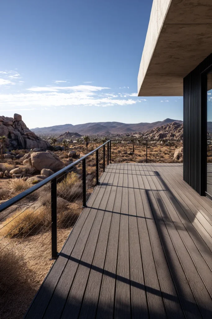This raised deck sits alongside a modern home and overlooks a rugged desert landscape. Smooth wood decking and slim metal railings keep the look clean and minimal. The surrounding rocks and distant hills add texture and depth to the view.