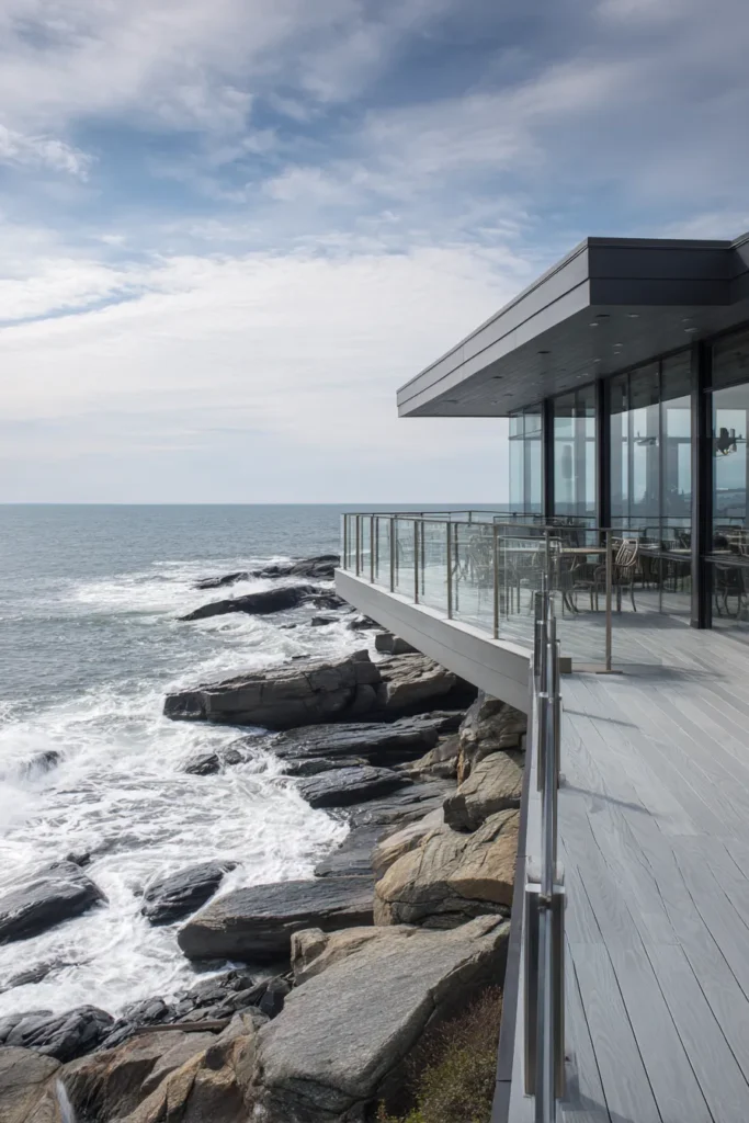 I find this design so impressive because it feels brave yet elegant. The glass railing lets the ocean steal the spotlight, which I absolutely love. It feels dramatic without being overwhelming.