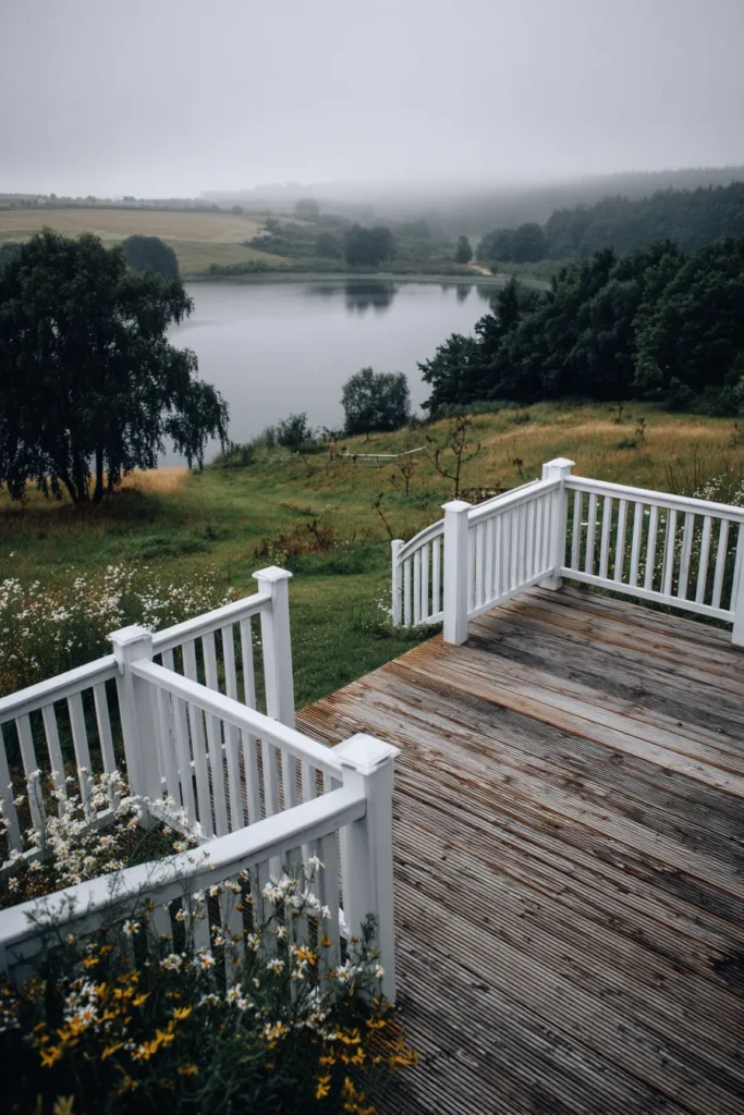 Classic White Railing Deck Overlooking a Quiet Lake