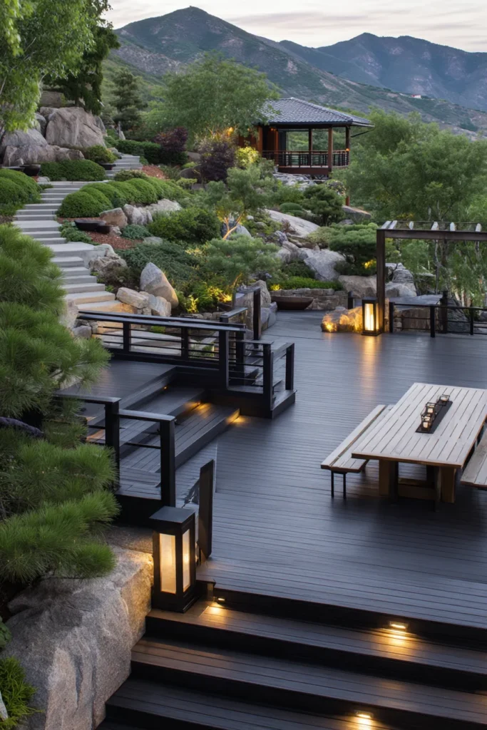 This raised deck is designed in layered levels that follow the natural slope of the hillside. Dark wood decking contrasts beautifully with surrounding greenery while built in lighting adds warmth and depth as the space steps downward. The layout feels intentional and structured while still letting the mountain scenery remain the star.