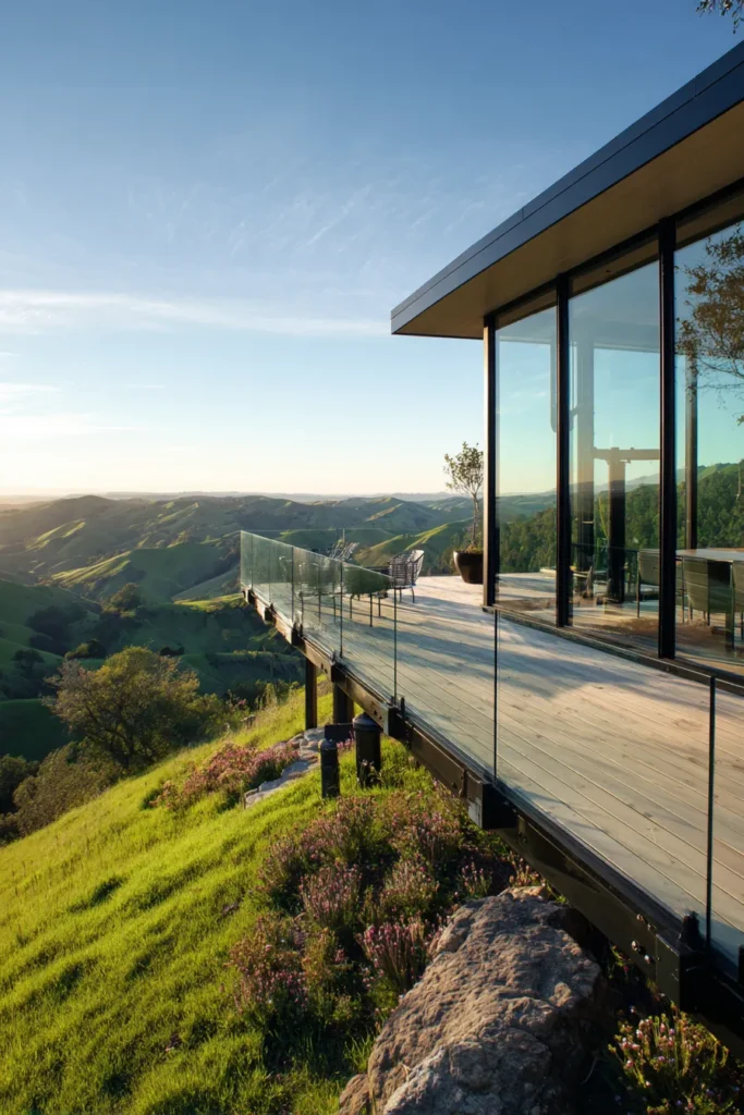 This elevated deck extends outward from a sleek modern home and hovers above a lush green hillside. Clean lines, pale wood flooring, and a glass railing keep the design feeling light and open. The view stretches far across rolling valleys and distant hills.