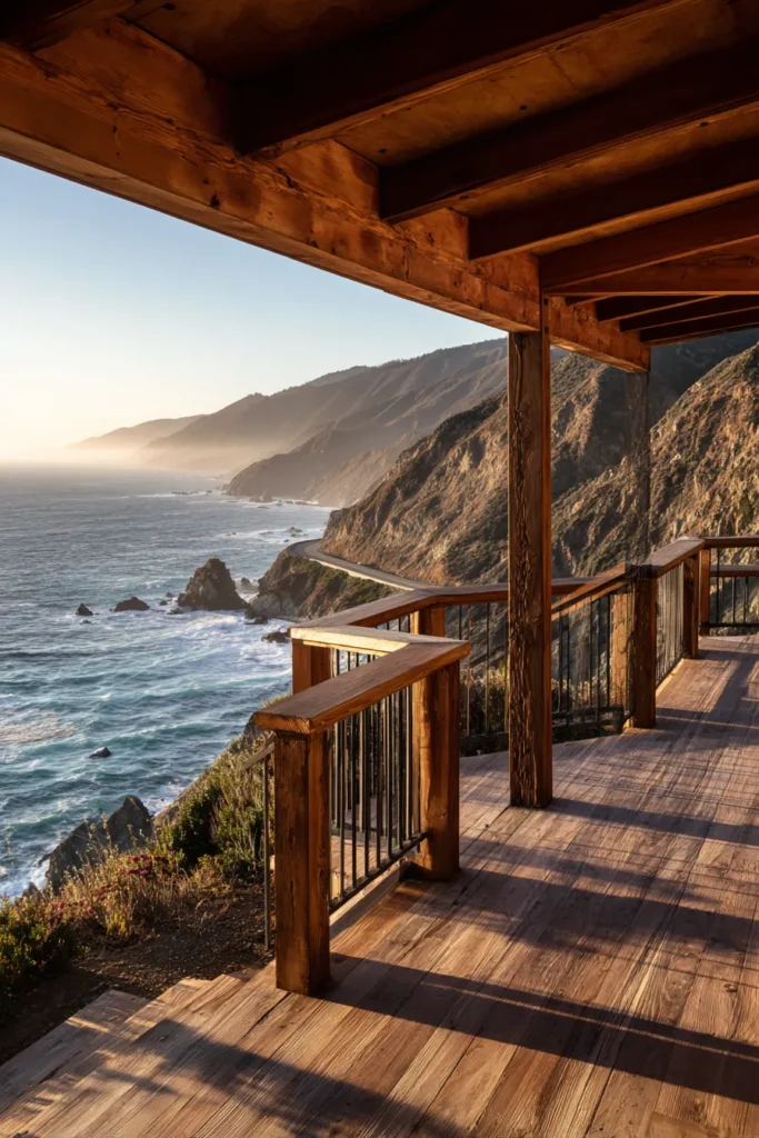 This raised deck features rich wood beams and classic railings that frame a dramatic ocean coastline. The deck is tucked beneath a covered roof, adding shade and depth while still keeping the view wide open. Waves and rugged cliffs create a powerful natural backdrop.