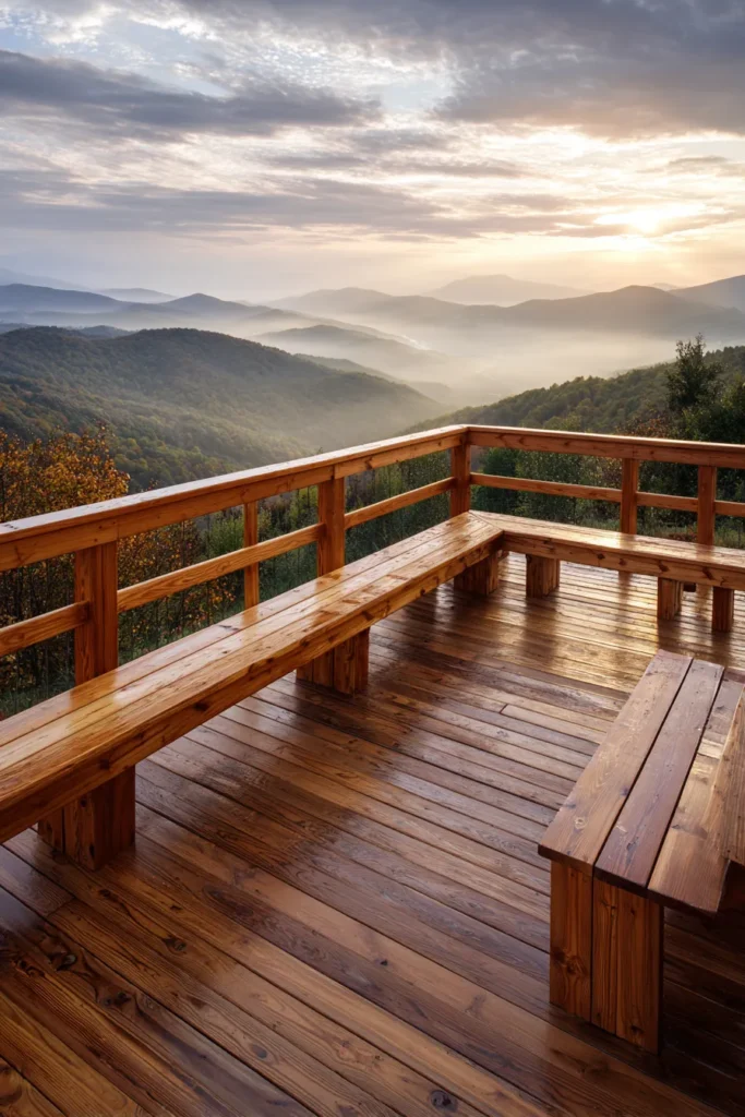 This raised deck features rich natural wood flooring and matching railings that feel sturdy and inviting. The deck is positioned high above rolling mountain layers, with the view opening up toward soft hills and a glowing sky. Clean lines, simple bench seating, and the slightly glossy finish of the wood make the space feel polished while still very connected to nature.