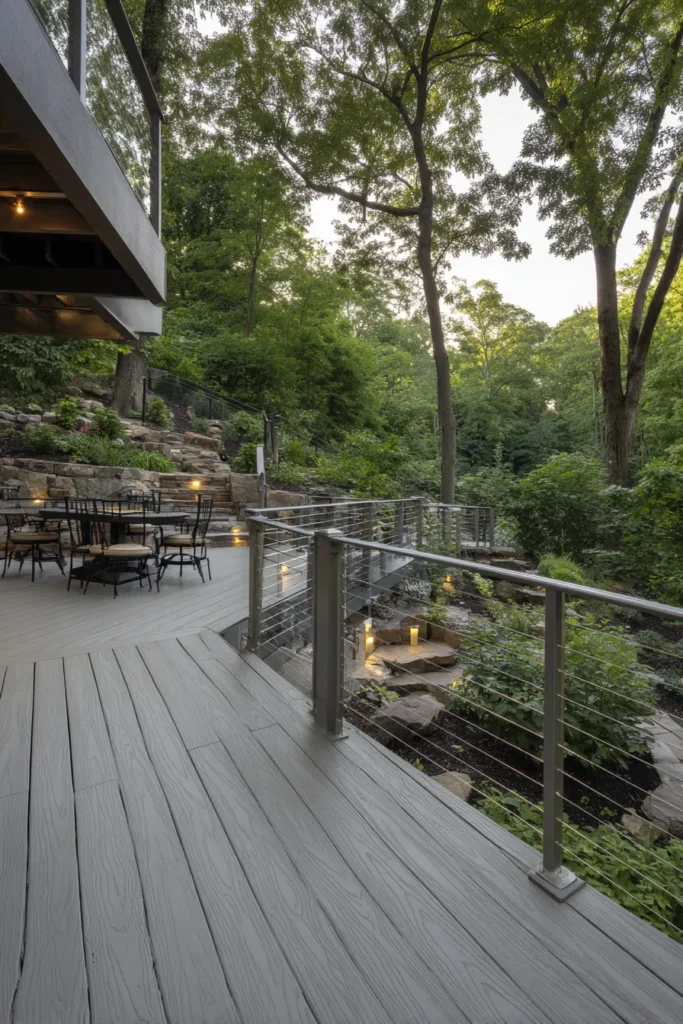 This elevated deck sits along the edge of a wooded landscape and features smooth gray decking with a modern railing. The space opens toward trees and greenery, creating a peaceful setting that still feels spacious. The layout feels perfect for slow outdoor meals and quiet evenings.