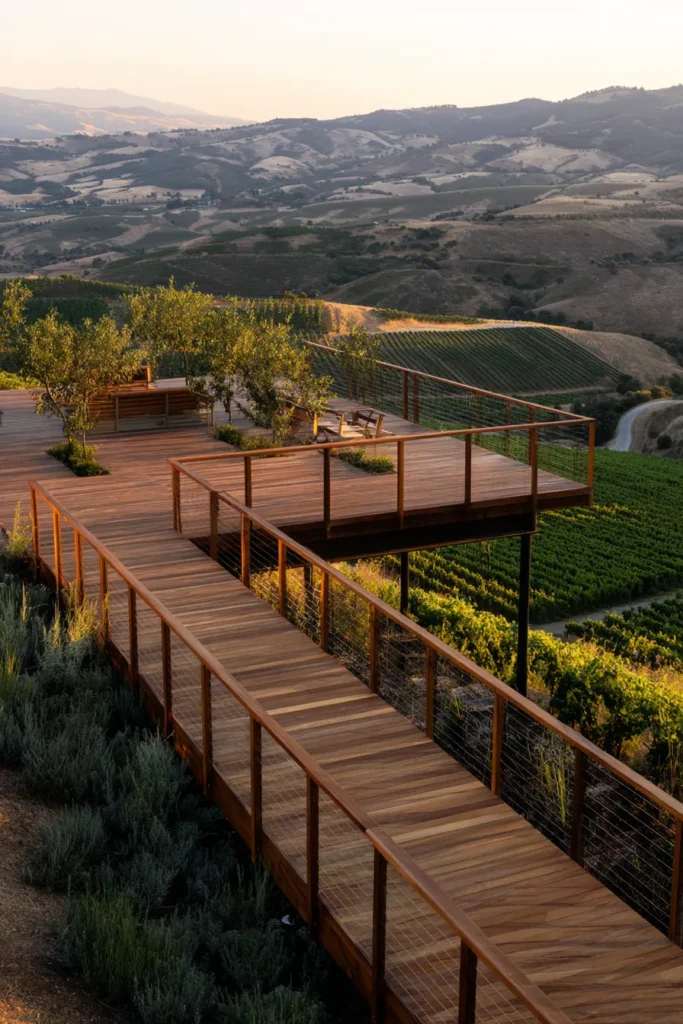 This raised deck stretches outward with a long wood walkway that leads toward rolling vineyard hills. Warm wood tones and simple railings keep the focus on the landscape. The elevated position offers sweeping views across layered fields and distant mountains.