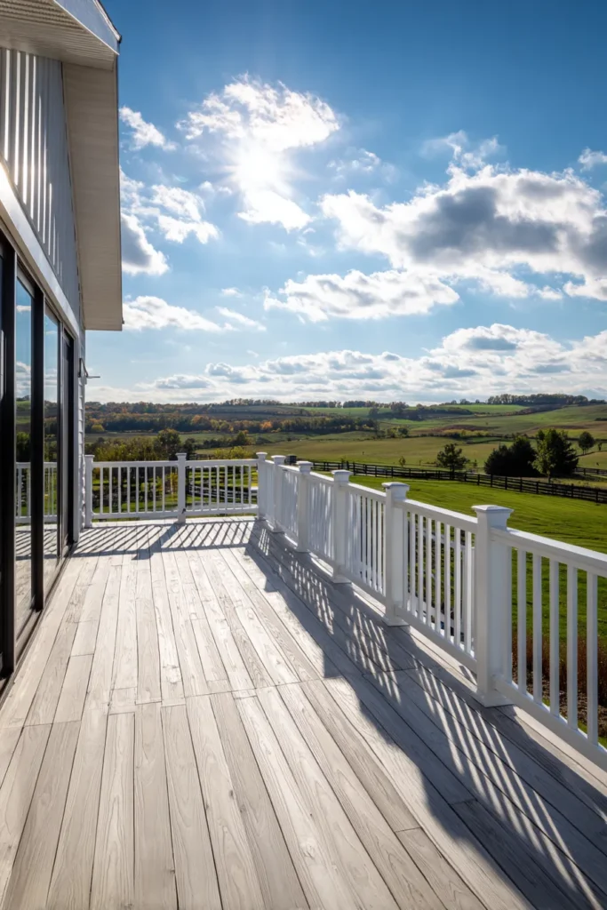 This elevated deck overlooks rolling hills and open land, using warm wood decking and simple railing details. The deck stretches outward, allowing sunlight to flood the space and highlight the natural grain of the wood. Everything about the design feels airy and open.